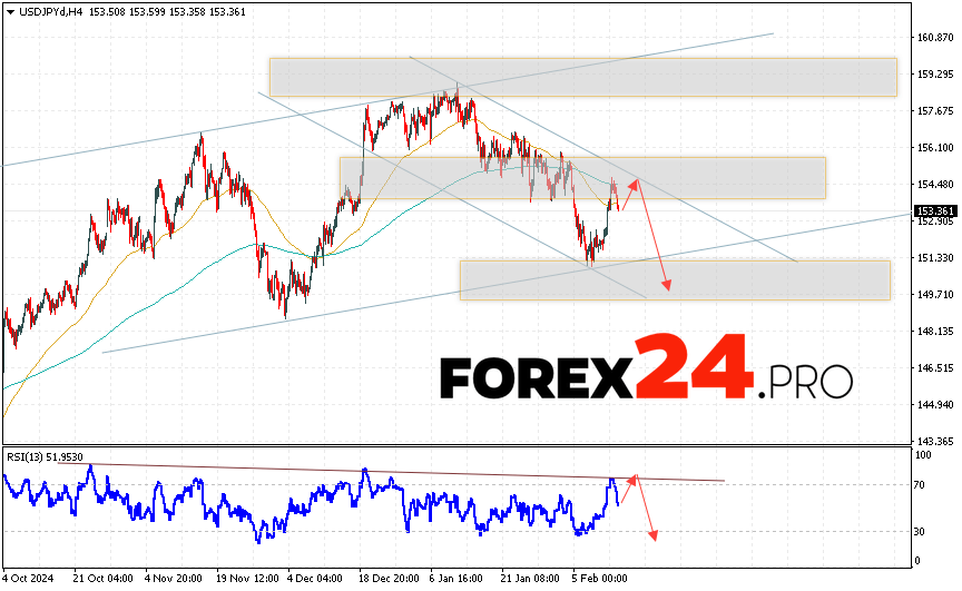 USD/JPY Forecast Japanese Yen for February 14, 2025 suggests an attempt to test the resistance area near the 154.45 level. Then, a continuation of the fall in quotes to the area below the 149.75 level. A test of the resistance line on the relative strength indicator will be in favor of the pair’s decline. A strong growth and a breakout of the 156.15 area will cancel the fall option. This will indicate a breakout of the resistance level and continued growth for the pair with a potential target above the 158.75 level.
