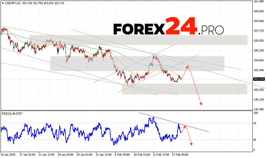 USD/JPY Forecast Japanese Yen for February 19, 2025 suggests an attempt to test the resistance area near the 152.85 level. Then, a continuation of the fall in quotes to the area below the 148.75 level. A test of the resistance line on the relative strength indicator will be in favor of the decline of the pair. The cancellation of the fall option will be strong growth and a breakout of the 153.65 area. This will indicate a breakout of the resistance level and continued growth in the pair with a potential target above the level of 155.85.