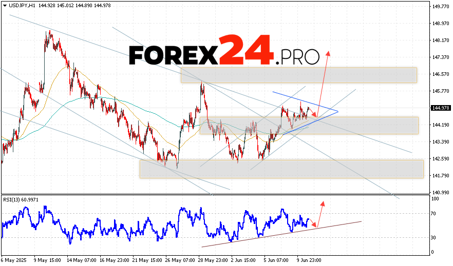 USDJPY Forecast Japanese Yen for June 11, 2025 suggests an attempt to develop a bullish correction with a test of the support zone near the level of 144.35. Then, the continuation of the bullish momentum of quotes to the area above 147.45. In favor of the rise of the pair will be a test of the trend line on the relative strength indicator. The growth option will be canceled by the quotes falling and breaking through the 143.65 area. This will indicate the breakdown of the support level and the continuation of the pair growth with a potential target below the 141.65 level.