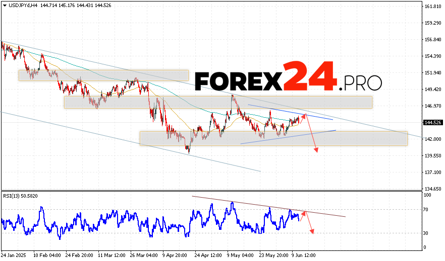 USD/JPY Forecast Japanese Yen for June 12, 2025 suggests an attempt to develop a bullish correction with a test of the resistance zone near the 145.05 level. Then, the bearish momentum of quotes will continue to develop in the area below the 139.45 mark. A test of the trend line on the relative strength indicator will support the pair’s decline. A strong rise in quotes and a breakout of the 146.75 area will cancel the decline scenario. This will indicate a breakout of the resistance level and a continuation of the pair’s growth with a potential target above the 148.45 level.