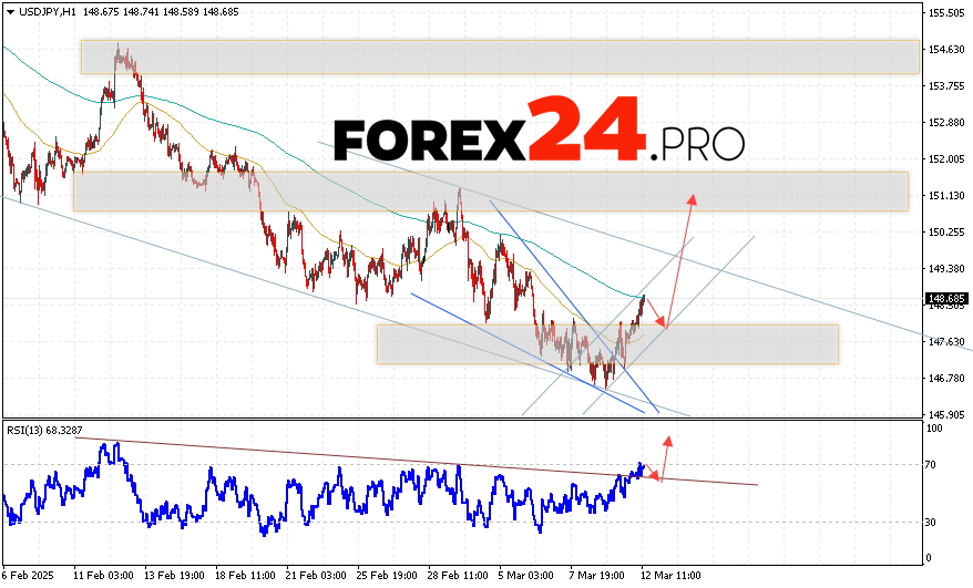 The USD/JPY currency pair continue to move within the development of growth and a descending channel. At the time of publication of the forecast, the US Dollar to Japanese Yen exchange rate is 148.68. Moving averages indicate the presence of a short-term bearish trend for the pair. Prices are again testing the area between the signal lines, which indicates pressure from sellers of the US Dollar and a potential continuation of the fall in prices from the current levels. As part of the forecast of the Japanese Yen exchange rate for March 13, 2025, we should expect an attempt to develop a fall and a test of the support area near the level of 147.95. Next, a rebound in price upward and continued growth of the USD/JPY pair to the area above the level of 151.25.