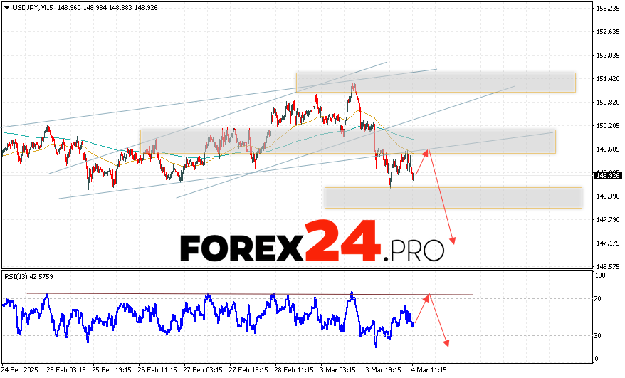 USD/JPY Forecast Japanese Yen for March 5, 2025 suggests an attempt to reduce the price of the currency pair and a test of the resistance area near the 149.55 level. Then, the continuation of the development of the bearish impulse of quotes to the area below the 147.15 level. A test of the resistance line on the relative strength indicator will be in favor of the fall of the pair. The cancellation of the fall option will be a strong growth and a breakout of the 150.65 area. This will indicate a breakout of the resistance level and continued growth in the pair with a potential target above the 152.35 level.