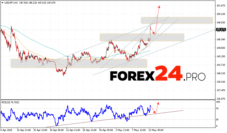 USDJPY Forecast Japanese Yen for May 13, 2025 suggests an attempt to reduce the price of the currency pair and test the support area near the level of 146.25. Then, the continuation of the development of bullish momentum quotes in the area above the level of 151.65. In favor of the growth of the pair will be a test of the support line on the relative strength indicator. The growth option will be canceled by a fall and breakdown of the 145.35 area. This will indicate the breakdown of the support level and the continuation of the pair’s decline with a potential target below the 143.35 level.