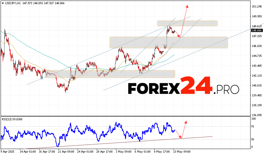 USDJPY Forecast Japanese Yen for May 14, 2025 suggests an attempt to reduce the price of the currency pair and test the support area near the level of 147.35. Then, the continuation of the bullish momentum of quotes to the area above the level of 151.25. In favor of the growth of the pair will be a test of the support line on the relative strength indicator. Cancellation of the growth option will be a fall and breakdown of the area of 146.45. This will indicate the breakdown of the support level and the continuation of the pair decline with a potential target below the level of 143.95.