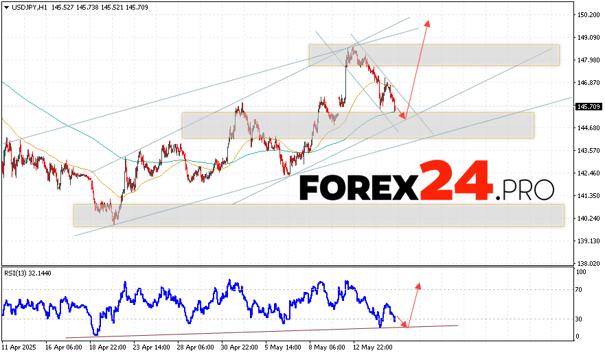 USDJPY Forecast Japanese Yen for May 16, 2025 anticipates a downward attempt to reduce the currency pair’s price and test the support area near 144.75. Then, continuation of the bullish momentum in the region above 149.65. A rise in the pair would be supported by testing the support line on the Relative Strength Index (RSI). Cancellation of the growth option will be signaled by a drop and break through the area of 144.15, indicating a breakout of the support level and continuation of the decline in the currency pair with a potential target below 142.05.
