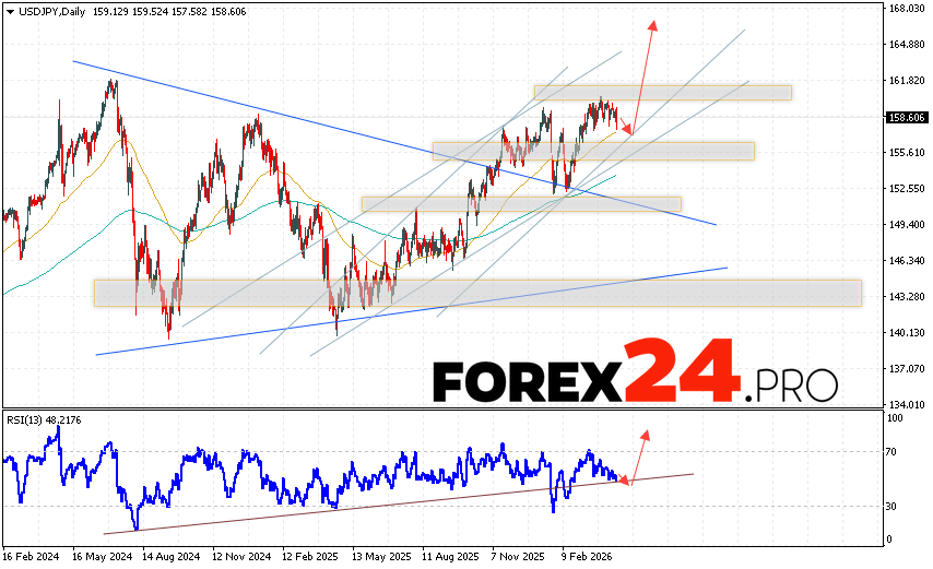 USDJPY Weekly Forecast April 20 – 24, 2026 suggests an attempt at a bearish correction and a test of support near 157.25. From there, we should expect the pair to continue rising above 165.65. A test of the trendline on the relative strength indicator (RSI) would be an additional signal of growth. A decline and a break of 153.25 would cancel out the upside scenario. This would indicate continued decline with a potential target below 150.85.