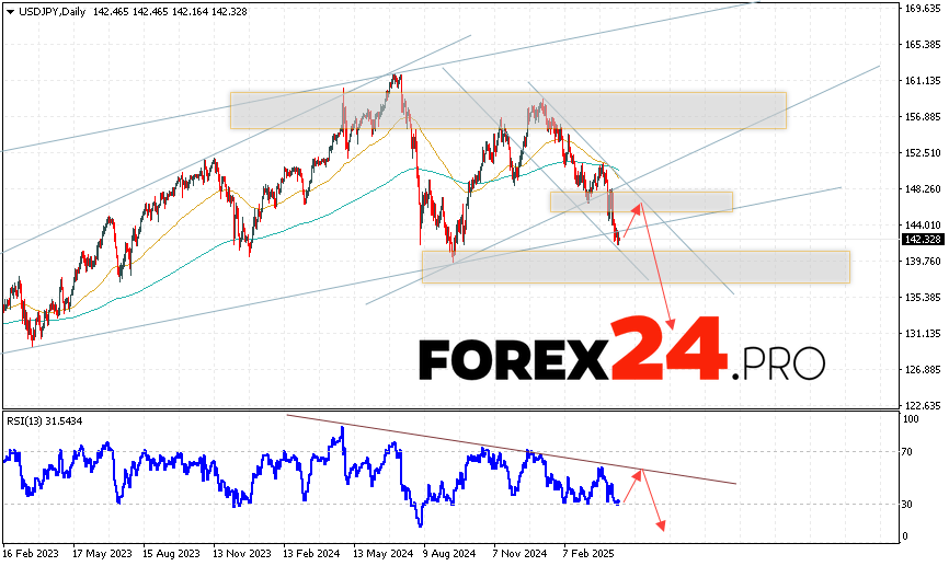 USD/JPY Weekly Forecast April 21 — 25, 2025 suggests an attempt to develop a bullish correction and a test of the resistance level near the area of 144.45. From where we should expect a continuation of the fall of the pair to the area below the level of 131.15. An additional signal in favor of the decline will be a test of the trend line on the relative strength indicator. The cancellation of the option of the pair’s fall will be strong growth and a breakout of the level of 148.55. This will indicate a continuation of the rise in the pair with a potential target above the 152.25 area.