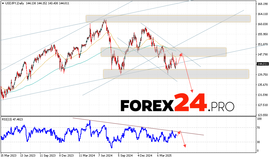 USD/JPY Weekly Forecast June 2 — 6, 2025 anticipates an attempt at developing a bull correction and testing the resistance level near the area of 147.65. From where we can expect the pair’s fall below the zone of 131.85. An additional signal in favor of depreciation will be testing the trend line on the Relative Strength Index indicator. Rejection of the option for the pair to fall will come from strong growth and a breakout above the level of 151.75. This indicates continuation of the rise in the pair with a potential target area above the zone of 154.05.