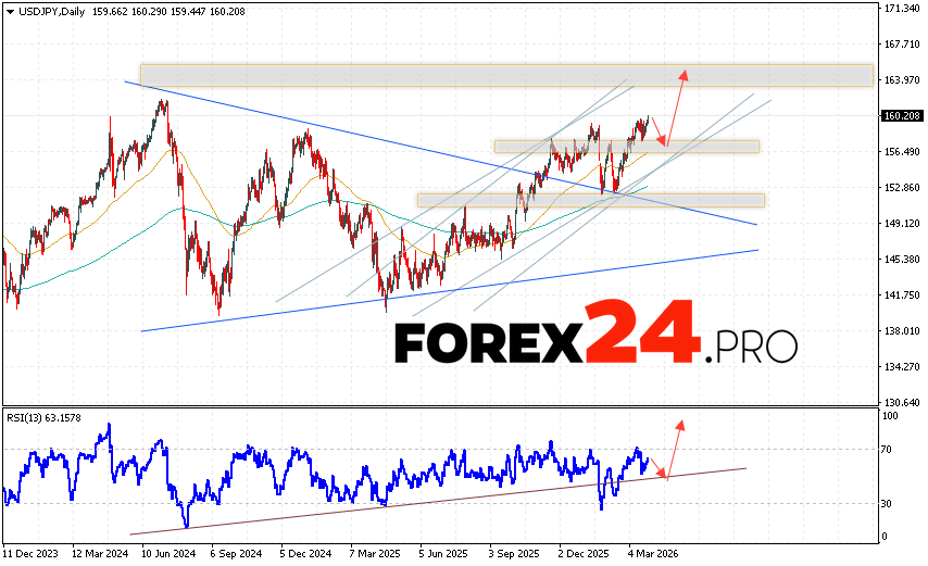 USDJPY Weekly Forecast March 30 – April 3, 2026 suggests an attempt at a bearish correction and a test of the support level near 156.85. From there, we should expect continued growth above 164.35. An additional signal in favor of growth would be a test of the trend line on the relative strength indicator. The pair’s upward trend would be cancelled if it falls and breaks below 153.65. This would indicate continued decline with a potential target below 151.25.